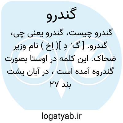 گندرو. [ گ َ دِ ]( اِخ ) نام وزیر ضحاک. این کلمه در اوستا بصورت گندروه آمده است، در آبان یشت بند 27 از این شخص با صفت زرین پاشنه ( زئی ری پاشنم ) یاد شده است و در کتب متأخران او را ( کندرب زره پاشنه ) خوانده اند به معنی ( کسی که آب دریا تا پاشنه او بود ). در این قول کلمه زئیری اوستایی را که بمعنی زرین است با کلمه دیگر اوستایی زریا که به معنی دریا است اشتباه کرده اند، در شاهنامه نیز گندرو نام وزیر ضحاک است: