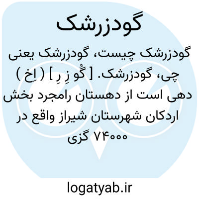 گودزرشک. [ گُو زِ رِ ] ( اِخ ) دهی است از دهستان رامجرد بخش اردکان شهرستان شیراز واقع در 74000 گزی جنوب خاور اردکان و4000 گزی راه فرعی پل خان به کامفیروز. جلگه و معتدل مالاریایی است و سکنه آن 47 تن است. آب آن از رود کر تأمین میشود. محصول آن غلات و شغل اهالی زراعت و راه آن مالرو است. ( از فرهنگ جغرافیایی ایران ج 7 ).