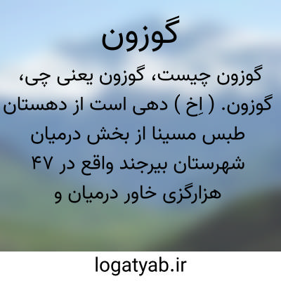 گوزون. ( اِخ ) دهی است از دهستان طبس مسینا از بخش درمیان شهرستان بیرجند واقع در 47 هزارگزی خاور درمیان و 9 هزارگزی خاور طبس. کوهستانی و گرم سیر است و 26 تن سکنه دارد. آب آن از قنات و محصول آن غلات و شلغم و شغل اهالی زراعت و مالداری است. راه مالرو دارد. ( از فرهنگ جغرافیایی ایران ج 9 ).