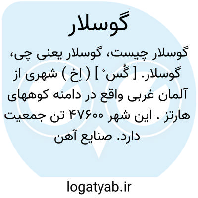 گوسلار. [ گُس ْ ] ( اِخ ) شهری از آلمان غربی واقع در دامنه کوههای هارتز. این شهر 47600 تن جمعیت دارد. صنایع آهن سازی و مکانیک آن قابل ذکر است و ابنیه باستانی نیز دارد.