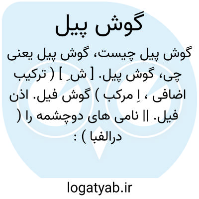 گوش پیل. [ ش ِ ] ( ترکیب اضافی، اِ مرکب ) گوش فیل. اذن فیل. || نامی های دوچشمه را ( درالفبا ): و ها از بسیار گونه کنند، های دوچشمه که دو صفر متصاعد بر سر هم باشند آن را گوش پیل خوانند... ( راحةالصدور ص 444 فی معرفة اصول الخط ).