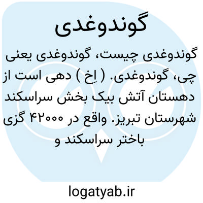 گوندوغدی.( اِخ ) دهی است از دهستان گرم بخش ترک شهرستان میانه. واقع در 17هزارگزی جنوب خاوری بخش و 1000گزی خاور میانه. کوهستانی و هوای آن معتدل و سکنه آن 1451 تن است. آب آن از چشمه تأمین میشود. محصولات عمده آنجا غلات و حبوبات است و شغل اهالی زراعت و گله داری است. راه مالرو دارد. ( از فرهنگ جغرافیایی ایران ج 4 ).