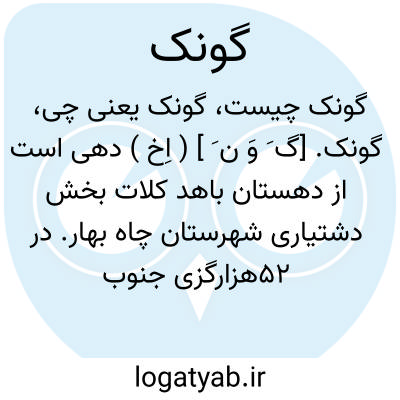 گونک. [گ َ وَ ن َ ] ( اِخ ) دهی است از دهستان باهد کلات بخش دشتیاری شهرستان چاه بهار. در 52هزارگزی جنوب خاوری دشتیاری کنار مرز پاکستان. جلگه و هوای آن گرمسیر و سکنه آن 150 تن است. آب آن از چاه است. محصول آنجا ذرت، حبوبات و لبنیات و شغل اهالی زراعت و گله داری است. راه مالرو دارد. ( از فرهنگ جغرافیایی ایران ج 8 ).
