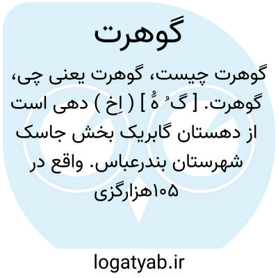 گوهرت. [ گ ُ هَُ ] ( اِخ ) دهی است از دهستان گابریک بخش جاسک شهرستان بندرعباس. واقع در 105هزارگزی خاور جاسک و 5هزارگزی جنوب راه مالرو جاسک به چاه بهار. جلگه و هوای آن گرمسیر و سکنه آن 490 تن است. آب آن از رودخانه تأمین میگردد. محصولات عمده آن خرما و شغل اهالی، زراعت و صید ماهی است. راه مالرو دارد. ( از فرهنگ جغرافیایی ایران ج 8 ).