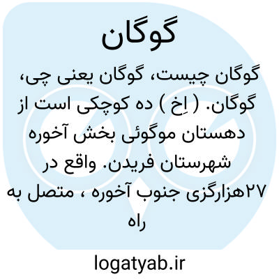 گوگان. ( اِخ ) ده کوچکی است از دهستان موگوئی بخش آخوره شهرستان فریدن. واقع در 27هزارگزی جنوب آخوره، متصل به راه مالرو گوگان به آخوره. کوهستانی و هوای آن معتدل و سکنه آن 47 تن است. آب آن از چشمه و محصول آن غلات و شغل اهالی زراعت و گله داری و راه آن مالرو است. ( از فرهنگ جغرافیایی ایران ج 10 ).
