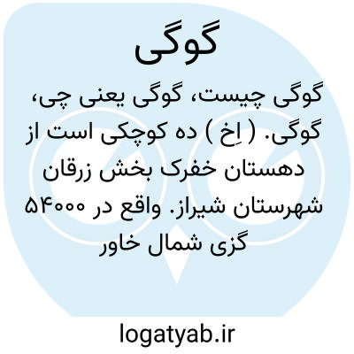 گوگی. ( اِخ ) ده کوچکی است از دهستان خفرک بخش زرقان شهرستان شیراز. واقع در 54000 گزی شمال خاور زرقان و 1000 گزی راه فرعی سیوند به محمودآباد. سکنه آن 41 تن است. ( از فرهنگ جغرافیایی ایران ج 7 ).