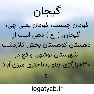 گیجان. ( اِخ ) دهی است از دهستان کوهستان بخش کلاردشت شهرستان نوشهر. واقع در 30هزارگزی جنوب باختری مرزن آباد و 10هزارگزی باختری شوسه چالوس به تهران. محلی کوهستانی و هوای آن سردسیر و سکنه آن 75 تن است. آب آن از چشمه تأمین میشود. محصول عمده آن غلات، لبنیات، گردو و ارزن و شغل اهالی زراعت و گله داری است. ( از فرهنگ جغرافیایی ایران ج 3 ).