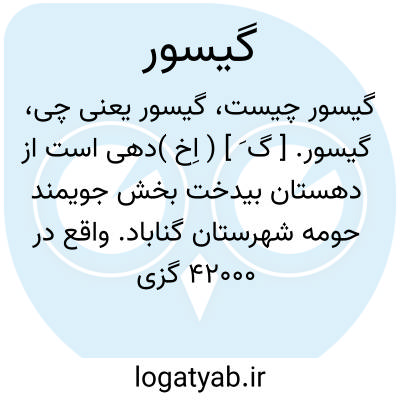 گیسور. [ گ َ ] ( اِخ )دهی است از دهستان بیدخت بخش جویمند حومه شهرستان گناباد. واقع در 42000 گزی خاور گناباد. محلی جلگه و هوای آن گرمسیر و سکنه آن 352 تن است. آب آن از قنات تأمین میشود. محصول آن غلات، ارزن، و ابریشم و شغل اهالی زراعت است. ( از فرهنگ جغرافیایی ایران ج 9 ).