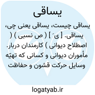 یساقی. [ ی َ ] ( ص نسبی ) ( اصطلاح دیوانی ) کارمندان دربار. مأموران دیوانی و کسانی که تهیّه وسایل حرکت قشون و حفاظت راه را بر عهده داشتند. ( سازمان اداری حکومت صفوی ص 59 ): در ذکر خلاصه مداخل و مخارج ولایات ایران، مداخل... بابت مرد یساقی: پانصد نفر سرکار دیوانی... بابت مرد یساقی: پانصد نفر ( ب ). ( تذکرة الملوک چ دبیرسیاقی ص 89 ). عراق، سرکار اوارجه عراق... عن مرد یساقی پانصد نفر. ( تذکرة الملوک ص 89 ).ارقام و احکام سیورغالات و... یساقیان و چریک به مهراو می رسید. ( تذکرة الملوک ص 41 ). خرج - سایر عن مرد یساقی کلهر: پانصد نفر. ( تذکرة الملوک ص 91 ). تیول و مواجب همه ساله - سایر: عن مرد یساقی ایل کلهر: پانصد نفر. ( تذکرة الملوک ص 92 ). و رجوع به یساق شود. || سپاهی. ( میرزا مهدی خان، سنگلاخ ص ب 331 ).