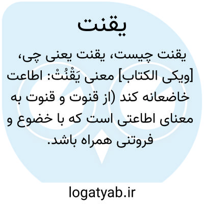 [ویکی الکتاب] معنی یَقْنُتْ: اطاعت خاضعانه کند (از قنوت و قنوت به معنای اطاعتی است که با خضوع و فروتنی همراه باشد. جزمش به دلیل شرط شدن برای بعد از خود می باشد )