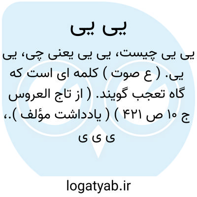 کلمه ایست که گاه تعجب گویند.، ی ی ی آوازی است که با آن گفتار کسی را به مسخره تقلید کردن خواهند. آوازیست که بدین صورت از دهان بر آرند برای به استهزائ تقلید کردن کسی.