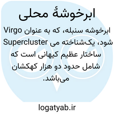 {local supercluster} [نجوم رصدی و آشکارسازها] مجموعه ای شامل د وهزار کهکشان که به شکل خوشه ها و گروه هایی از کهکشان ها در صورت فلکی سنبله مشاهده می شود متـ. اَبَرخوشۀ سنبله Virgo supercluster