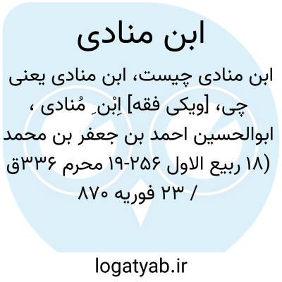 [ویکی فقه] اِبْن ِ مُنادی، ابوالحسین احمد بن جعفر بن محمد (۱۸ ربیع الاول ۲۵۶-۱۹ محرم ۳۳۶ق / ۲۳ فوریه ۸۷۰ -۱۰ اوت ۹۴۷م )، محدث، مقری و فقیه حنبلی بغداد است.
