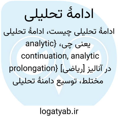 {analytic continuation, analytic prolongation} [ریاضی] در آنالیز مختلط، توسیع دامنۀ تحلیلی بودن یک تابع تحلیلی