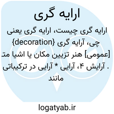 {decoration} [عمومی] هنر تزیین مکان یا اشیا متـ. آرایش 4، آرایی * آرایی در ترکیباتی مانند صحنه آرایی و گل آرایی به کار می رود.