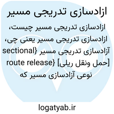 آزادسازی تدریجی مسیر {sectional route release} [حمل ونقل ریلی] نوعی آزادسازی مسیر که در آن معمولاً با عبور قطار از هر قطعه از خط، قطعات به تدریج آزاد می شود
