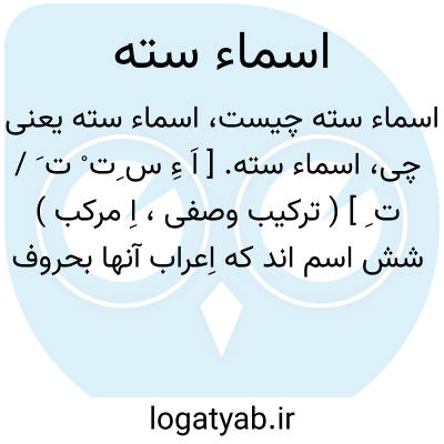 اسماء سته. [ اَ ءِ س ِت ْ ت َ / ت ِ ] ( ترکیب وصفی، اِ مرکب ) شش اسم اند که اِعراب آنها بحروف است ( رفع بواو، نصب بالف و جر بیاء ) و این شش اسم عبارت است از: اب، اخ، حم، هن، فم، ذو.