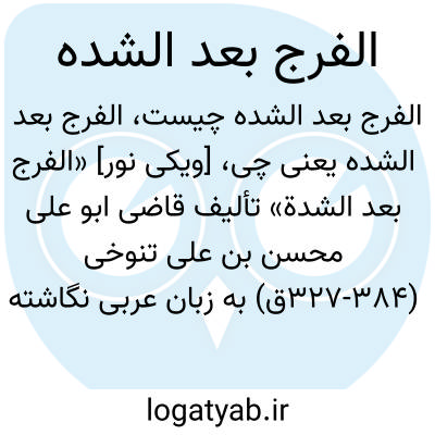 [ویکی نور] «الفرج بعد الشدة» تألیف قاضی ابو علی محسن بن علی تنوخی (327-384ق) به زبان عربی نگاشته است. در کتاب به داستان هایی پرداخته شده که موضوعش فرج بعد از شدت است و دعاهایی نیز در این باب ذکر شده است. تنوخی که نوع «گشایش» را با احوال ناخوش خود مناسب می دید، به جمع آوری داستان هایی با موضوع یاد شده پرداخت. هم چنین هدف نویسنده ذکر تأثیر رفتار انسانی و اخلاقی قهرمانان داستان هایش در رهایی آنها از مشکلات است.