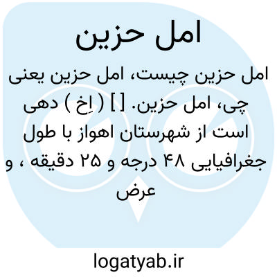 امل حزین. [ ] ( اِخ ) دهی است از شهرستان اهواز با طول جغرافیایی 48 درجه و 25 دقیقه، و عرض جغرافیایی 30 درجه و 45 دقیقه. ( از فرهنگ آبادیهای ایران ).