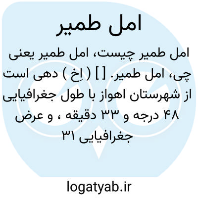 امل طمیر. [ ] ( اِخ ) دهی است از شهرستان اهواز با طول جغرافیایی 48 درجه و 33 دقیقه، و عرض جغرافیایی 31 درجه و 15 دقیقه. ( از فرهنگ آبادیهای ایران ).