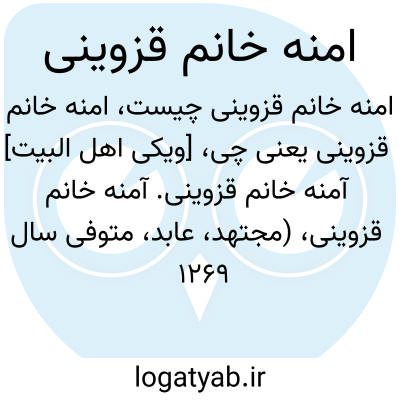 [ویکی اهل البیت] آمنه خانم قزوینی. آمنه خانم قزوینی، (مجتهد، عابد، متوفی سال 1269 هـ.ق) و دختر شیخ محمدعلی قزوینی از علمای قزوین، و نوه سید حسین قزوینی و مادرش ربابه خانم بود. در حدود هفده سالگی با شیخ محمدصالح برغانی ازدواج کرد.
