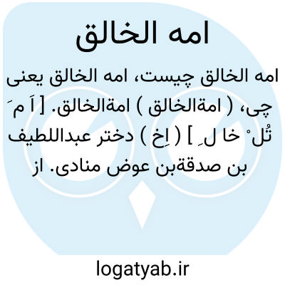 ( امةالخالق ) امةالخالق. [ اَ م َ تُل ْ خا ل ِ ] ( اِخ ) دختر عبداللطیف بن صدقةبن عوض منادی. از زنان محدث و شاعر و از شاگردان جمال الدین حنبلی و از مشایخ سیوطی بوده و به سال 920 هَ.ق. درگذشته است. صاحب خیرات حسان از اشعار وی بنقل از سیوطی آورده است. ( از ریحانة الادب ج 1 ص 105 ) ( از خیرات حسان ج 1 ص 33 ). و رجوع به خیرات حسان و قاموس الاعلام ترکی شود.