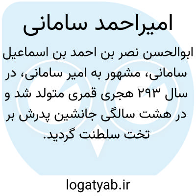 [ویکی فقه] ابوالحسن نصر بن احمد بن اسماعیل سامانی (۲۹۳ تا ۳۳۱ (قمری)) امیر سامانی بود. امیر در هشت سالگی جانشین پادشاه شده است و بر تخت سلطنت جلوس می کند.