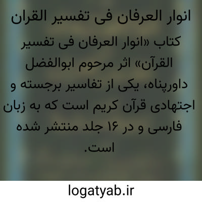 [ویکی فقه] انوار العرفان فی تفسیر القرآن (کتاب). این تفسیر به زبان فارسی ساده نگاشته شده و هدف آن تفسیر تمام قرآن به شیوه ترتیبی می باشد. مرحوم ابوالفضل داورپناه مؤلف این تفسیر در ترجمه و شرح آیات از نظم و نثر استفاده نموده و با وجود سادگی دارای مطالب علمی، آموزشی و ارشادی نیز می باشد.