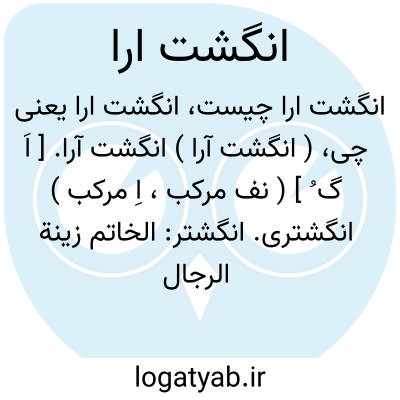 ( انگشت آرا ) انگشت آرا. [ اَ گ ُ ] ( نف مرکب، اِ مرکب ) انگشتری. انگشتر: الخاتم زینة الرجال و اسمه بالفارسیة «انگشت آرای ». ( ابواحمدبن ابی بکر الکاتب در مناظره با فقیهی در امر تختم بیمین، از جزء رابع یتیمة الدهر ).