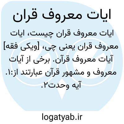 [ویکی فقه] آیات معروف قرآن. برخى از آیات معروف و مشهور قرآن عبارتند از:۱. آیه وحدت۲. آیه اطاعت از اولی الامر۳. آیه تطهیر۴. آیه حکومت مستضعفین۵. آیه جاءالحق۶. آیه و ان یکاد۷. آیه بسمله۸. آیه نفس مطمئنه۹. آیة الکرسی۱۰. آیة الوصیة۱۱. آیة الوام۱۲. آیة التوجه۱۳. آیه روزه۱۴. آیه کتمان۱۵. آیه نفی سبیل۱۶. آیه ولایت۱۷. آیه تصدیق۱۸. آیه نفر۱۹. آیه سؤال۲۰. آیه عزت۲۱. آیه نور۲۲. آیه مودت۲۳. آیه نبأ۲۴. آیه نحوی۲۵. آیه حساب در قیامت۲۶. آیه قصاص۲۷. آیه آمن الرسول۲۸. آیه امن یجیب۲۹. آیه خیر البریه۳۰. آیه اولوا الارحام۳۱. آیه اخلاص۳۲. آیه اسرا