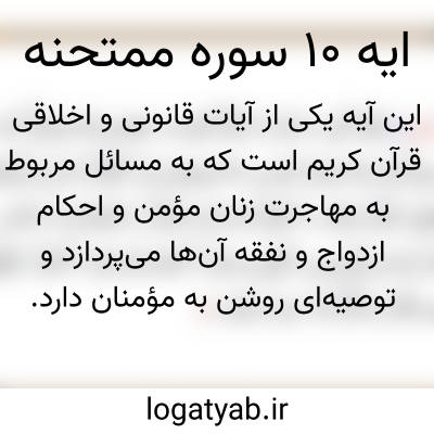 آیه ۱۰ سوره ممتحنه این‌گونه است: «یَا أَیُّهَا الَّذِینَ آمَنُوا إِذَا جَاءَکُمُ الْمُؤْمِنَاتُ مُهَاجِرَاتٍ فَامْتَحِنُوهُنَّ ۖ اللَّهُ أَعْلَمُ بِإِیمَانِهِنَّ ۖ فَإِنْ عَلِمْتُمُوهُنَّ مُؤْمِنَاتٍ فَلَا تَرْجِعُوهُنَّ إِلَی الْکُفَّارِ ۖ لَا هُنَّ حِلٌّ لَهُمْ وَلَا هُمْ یَحِلُّونَ لَهُنَّ ۖ وَآتُوهُمْ مَا أَنْفَقُوا ۚ وَلَا جُنَاحَ عَلَیْکُمْ أَنْ تَنْکِحُوهُنَّ إِذَا آتَیْتُمُوهُنَّ أُجُورَهُنَّ ۚ وَلَا تُمْسِکُوا بِعِصَمِ الْکَوَافِرِ وَاسْأَلُوا مَا أَنْفَقْتُمْ وَلْیَسْأَلُوا مَا أَنْفَقُوا ۚ ذَٰلِکُمْ حُکْمُ اللَّهِ ۖ یَحْکُمُ بَیْنَکُمْ ۚ وَاللَّهُ عَلِیمٌ حَکِیمٌ». این آیه یکی از آیات قانونی و اخلاقی قرآن کریم است که به مسائل مربوط به مهاجرت زنان مؤمن و احکام ازدواج و نفقه آن‌ها می‌پردازد و توصیه‌ای روشن به مؤمنان دارد. در این آیه، مؤمنان به تحقیق و امتحان ایمان این زنان تشویق شده‌اند تا اطمینان حاصل شود که ایمانشان واقعی است، هرچند که خداوند به صدق و کذب ایمان آنان آگاه‌تر است. اگر ایمان آن‌ها احراز شد، دیگر نباید آن‌ها را به شوهران کافرشان بازگردانید، چرا که این زنان مؤمن بر مردان کافر حرام‌اند و بالعکس. همچنین آیه به مسائل مهر و نفقه اشاره دارد و بیان می‌کند که پرداخت هزینه‌ها و مهر زنان پیشین باید انجام شود و هیچ اشکالی ندارد که مؤمنان با این زنان نکاح کنند به شرطی که اجر و مهر آن‌ها داده شود. آیه همچنین تأکید می‌کند که نباید به دنبال زنان کافر برای عقد و پیمان باشید و در صورت تغییر دین زنان و مردان، نفقه و حقوق مالی باید مطابق عدالت و شرع رعایت شود. این آیه بار معنایی حقوقی، اخلاقی و اجتماعی دارد و حکمت الهی در آن رعایت انصاف، محافظت از حقوق زنان و تشویق به ایمان است. از نظر معنایی، آیه با مفاهیمی مثل امتحان ایمان، حق ازدواج، حقوق مالی و حرام و حلال بودن روابط مرتبط است. این آیه نشان‌دهنده نظم اجتماعی و رعایت عدالت در روابط خانوادگی و مذهبی است و تأکید بر آگاهی و داوری الهی دارد.
