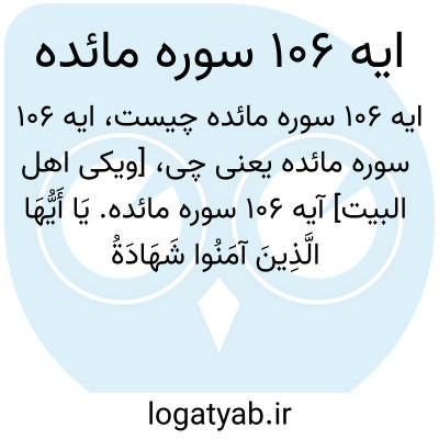 [ویکی اهل البیت] آیه 106 سوره مائده. یَا أَیُّهَا الَّذِینَ آمَنُوا شَهَادَةُ بَیْنِکُمْ إِذَا حَضَرَ أَحَدَکُمُ الْمَوْتُ حِینَ الْوَصِیَّةِ اثْنَانِ ذَوَا عَدْلٍ مِنْکُمْ أَوْ آخَرَانِ مِنْ غَیْرِکُمْ إِنْ أَنْتُمْ ضَرَبْتُمْ فِی الْأَرْضِ فَأَصَابَتْکُمْ مُصِیبَةُ الْمَوْتِ ۚ تَحْبِسُونَهُمَا مِنْ بَعْدِ الصَّلَاةِ فَیُقْسِمَانِ بِاللَّهِ إِنِ ارْتَبْتُمْ لَا نَشْتَرِی بِهِ ثَمَنًا وَلَوْ کَانَ ذَا قُرْبَیٰ ۙ وَلَا نَکْتُمُ شَهَادَةَ اللَّهِ إِنَّا إِذًا لَمِنَ الْآثِمِینَ