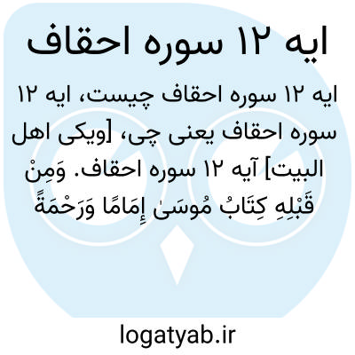 [ویکی اهل البیت] آیه 12 سوره احقاف. وَمِنْ قَبْلِهِ کِتَابُ مُوسَیٰ إِمَامًا وَرَحْمَةً ۚ وَهَٰذَا کِتَابٌ مُصَدِّقٌ لِسَانًا عَرَبِیًّا لِیُنْذِرَ الَّذِینَ ظَلَمُوا وَبُشْرَیٰ لِلْمُحْسِنِینَ