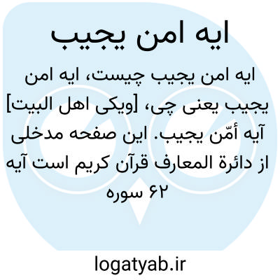 [ویکی شیعه] آیه امن یجیب. آیه أَمَّنْ یُجیب آیه ۶۲ سوره نمل است. بر اساس این آیه هرگاه فردی به اضطرار برسد و از خداوند درخواست حل مشکلش را نماید خداوند نیز خواسته او را اجابت و گرفتاریش را برطرف می کند. بر اساس برخی از روایات این آیه در مورد حضرت مهدی(عج) است.