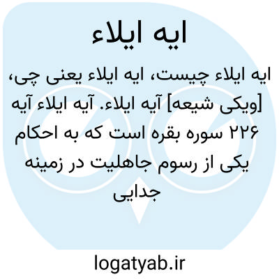 [ویکی شیعه] آیه ایلاء. آیه ایلاء آیه ۲۲۶ سوره بقره است که به احکام یکی از رسوم جاهلیت در زمینه جدایی زوجین می پردازد. ایلاء به معنای سوگندی است که مرد از روی خشم، برای ترک آمیزش با همسر خود به زبان می آورد. سوگند ایلاء، یکی از اقسام طلاق در زمان جاهلیت بود که برای تحت فشار قرار دادن زن و جلوگیری از ازدواج مجدد وی صورت می گرفت و او را سرگردان می ساخت. خداوند در این آیه علاوه بر محکوم کردن آن، احکام و راه های گشودن آن را بیان کرده است.