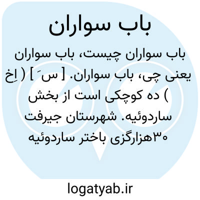 باب سواران. [ س َ ] ( اِخ ) ده کوچکی است از بخش ساردوئیه. شهرستان جیرفت 30هزارگزی باختر ساردوئیه سر راه فرعی ساردوئیه به راین. سکنه آن 24 تن. ( فرهنگ جغرافیائی ایران ج 8 ).