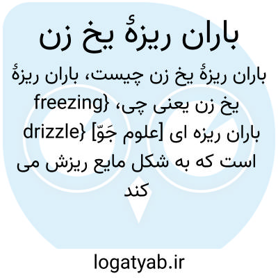 {freezing drizzle} [علوم جَوّ] باران ریزه ای است که به شکل مایع ریزش می کند ولی به محض برخورد با اشیا پوشش یخ شیشه ایجاد می کند
