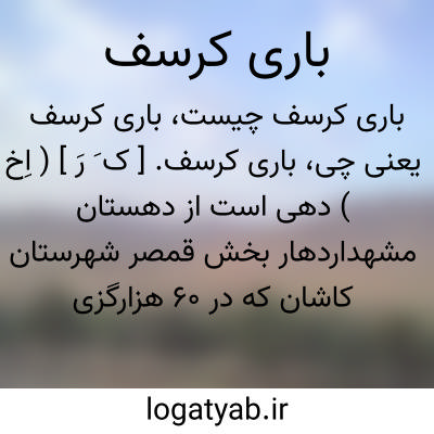 باری کرسف. [ ک َ رَ ] ( اِخ ) دهی است از دهستان مشهداردهار بخش قمصر شهرستان کاشان که در 60 هزارگزی شمال باختری قمصر سر راه فرعی کاشان به مشهداردهار واقع است. آبش از قنات. محصولش غلات، حبوبات، میوه جات. شغل مردمش زراعت، گله داری صنایع دستی زنان قالیبافی است. ( از فرهنگ جغرافیائی ایران ج 3 ).