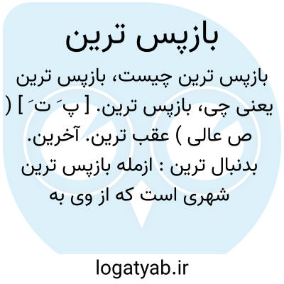 بازپس ترین. [ پ َ ت َ ] ( ص عالی ) عقب ترین. آخرین. بدنبال ترین: ازمله بازپس ترین شهری است که از وی به اندلس روند. ( حدود العالم ).