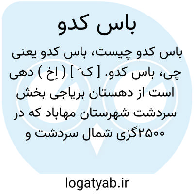 باس کدو. [ ک َ ] ( اِخ ) دهی است از دهستان بریاجی بخش سردشت شهرستان مهاباد که در 2500گزی شمال سردشت و در پانصدگزی شمال راه ارابه رو بیوران به سردشت در کوهستان واقع است. ناحیه ای است معتدل با 72 تن سکنه. آب آن از رودخانه سردشت تأمین میشود، محصول عمده آن غلات، توتون، مازوج، کتیرا و شغل مردمش زراعت و گله داری و صنایع دستی مردم آن جاجیم بافی وراه آن ارابه رواست. ( ازفرهنگ جغرافیایی ایران ج 4 ).
