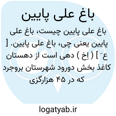 باغ علی پایین. [ ع َ ] ( اِخ ) دهی است از دهستان کاغذ بخش دورود شهرستان بروجرد که در 45 هزارگزی خاور دورود بر کنار راه شوسه اراک به دورود واقع است. ناحیه ای است کوهستانی و سردسیر و دارای 35 تن سکنه. آب آنجا از رودخانه و چشمه تأمین میشود. محصول عمده آن غلات و شغل مردمش زراعت وراهش مالرو است. ( از فرهنگ جغرافیایی ایران ج 6 ).