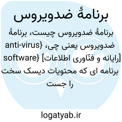 {anti-virus software} [رایانه و فنّاوری اطلاعات] برنامه ای که محتویات دیسک سخت را جست وجو می کند تا بدافزارهای آن، به ویژه ویروس ها، را پیدا کند و از بین ببرد یا ناکار کند متـ. نرم افزار ضدویروس ضدویروس anti-virus