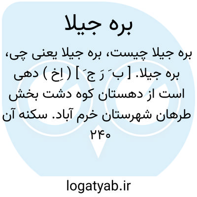 بره جیلا. [ ب َ رَ ج َ ] ( اِخ ) دهی است از دهستان کوه دشت بخش طرهان شهرستان خرم آباد. سکنه آن 240 تن. آب آن از چاه و محصول آن غلات است. اهالی این ده از طایفه گومه میباشند و در سیاه چادر سکونت دارند. ( از فرهنگجغرافیایی ایران ج 6 ).