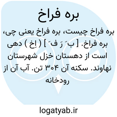 بره فراخ. [ ب َ رَ ف َ ] ( اِخ ) دهی است از دهستان خزل شهرستان نهاوند. سکنه آن 304 تن. آب آن از رودخانه تویسرکان و قنات و محصول آن غلات و حبوب و لبنیات است. ( از فرهنگجغرافیایی ایران ج 5 ).