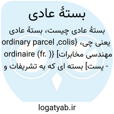 {ordinary parcel ,colis ordinaire (fr. )} [مهندسی مخابرات - پست] بسته ای که به تشریفات و اقدامات ویژه ای در انجام عملیات پُستی نیاز ندارد و مشتری برای نقل وانتقال آن خدمات خاصی درخواست نمی کند