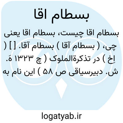 ( بسطام آقا ) بسطام آقا. [ ] ( اِخ ) در تذکرةالملوک ( چ 1323 هَ. ش. دبیرسیاقی ص 58 ) این نام به عنوان داروغه دفترخانه ای که در زمان شاه سلطان حسین صفوی قریب به دویست تومان تیول وی برآورد میشده،یاد شده است. رجوع به همین کتاب و همین صفحه شود.