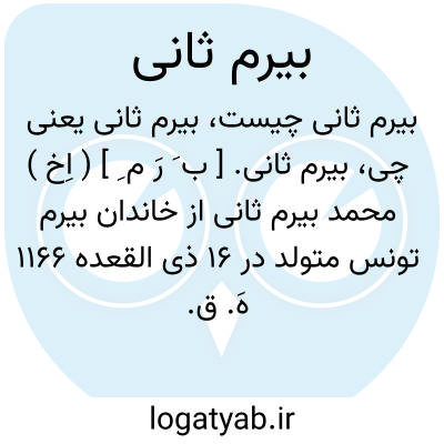 بیرم ثانی. [ ب َ رَ م ِ ] ( اِخ ) محمد بیرم ثانی از خاندان بیرم تونس متولد در 16 ذی القعده 1166 هَ. ق. وی در سال 1193 بسمت قضا و در سال 1206 به نقیب الاشرافی و مفتی و در سال 1215 به شیخ الاسلامی منصوب گردید و در16 ربیعالاول 1216 هَ. ق. درگذشت. او راست: حسن الابناء فی جوازالتحفظ من الادباء. ( از معجم المطبوعات ).