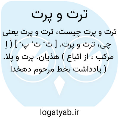 ترت و پرت. [ ت َ ت ُ پ َ ] ( اِ مرکب، از اتباع ) هذیان. پرت و پلا. ( یادداشت بخط مرحوم دهخدا ). || ( ص مرکب، از اتباع ) تار و مار. ترت و مرت. پخش و پلا. ( یادداشت ایضاً ).