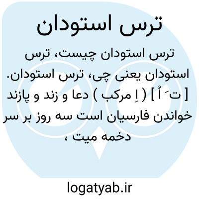 ترس استودان. [ ت َ اُ ] ( اِ مرکب ) دعا و زند و پازند خواندن فارسیان است سه روز بر سر دخمه میت، بواسطه آنکه گویند چون روح از قالب مفارقت نماید سه شبان روز ترس و بیم بسیار است. لهذا در این سه شبانه روز بر سر دخمه او نسک خوانند تا روح او از آن ایمن گردد. و معنی ترکیبی این لغت خوف قبر است، چه ترس بمعنی خوف و بیم باشد، واستودان دخمه و مقبره را گویند. ( برهان ) ( از انجمن آرا ) ( از آنندراج ). خواندن دعا و زند و پازند تا سه روز پس از مرگ کسی بر سر دخمه گور آن. ( ناظم الاطباء ). و ستودان نیز آمده، اصلش استخوان دان است. ( انجمن آرا ) ( آنندراج ). در بندهش ( فصل 28 بند 18 ) آمده: «درروزها و شبهایی که هنوز روح در زمین بسر می برد و بواسطه دیو ویزرش ( در اوستا ویزرش َ ) در بیم و هراس و معذب است، دیو ویزرش بر در ذوزخ آرام دارد. این روزها و شبها عبارتست از سه روز و سه شب که بنابه آیین مزدیسنا روان پس از فوت درسر بالین مرده می ماند و در روز چهارم از جسد مرده جدا شود. ( حاشیه برهان چ معین از یشتها ج 2 ص 162 ).