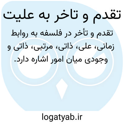 [ویکی فقه] تقدم و تأخر به علیت. تقدم یعنی جلو و پیش و در مرتبت اول و متقدم یعنی امری که از جهتی از جهات جلو و قبل باشد و وضع تاخر مقابل تقدم است.